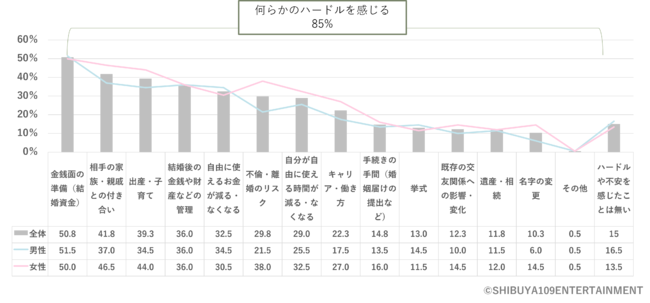 結婚に対して、何かしらのハードルを感じる※図10と答えたのは85.0%、最も多かったのは「金銭面の準備」(50.8%)となりました。
