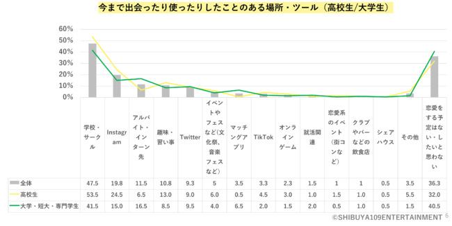 あくまで人生の楽しみの1つとして恋愛を楽しむZ世代。彼ら・彼女らはどのような恋愛を楽しんでいるのでしょうか。恋愛対象になる相手を探すにあたって、使ったことのある場所・ツール※図6を見てみると、「学校・サークル」(47.5%)「Instagram」(19.8%)「アルバイト・インターン先」(11.5%)が上位となりました。出会う場所、アプローチする場所に関して、Instagramは高校生だけで集計するとより高い割合となっています。