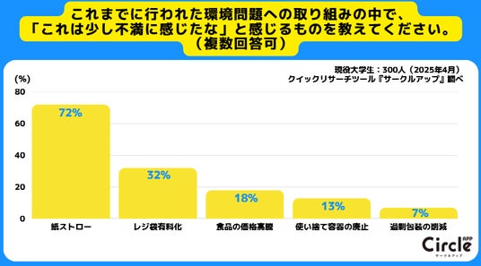 過去に不満を感じた施策(複数回答)で 紙ストローが72%、レジ袋有料化が32% とツートップとなりました。