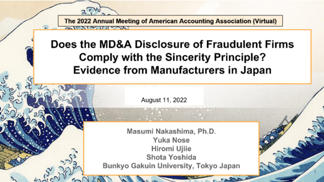 文京学院大学(学長:櫻井隆)は、8月11日に開催された2022年度米国会計研究学会年次大会(ヴァーチャル)において、経営学部中島真澄教授(専門:財務会計・実証会計学・財務諸表分析・フォレンジック会計)が共同研究を英語で報告したことを発表します。テーマは、「不正企業のMD&A開示情報は、誠実性の原則に準拠しているか?日本の製造業の実証」(英語表記:“Does the MD&A Disclosure of Fraudulent Firms Comply with the Sincerity Principle? Evidence from Manufacturers in Japan”)で、中島ゼミに所属する経営学部4年生の能勢優花さん、氏家弘海さん、3年生の吉田翔太さんとの共同研究の成果です。
