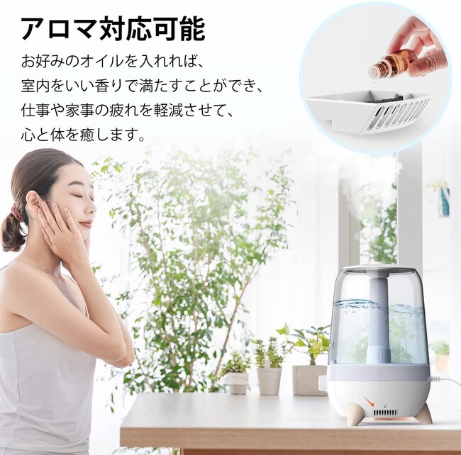 本体下部にアロマトレイが搭載されており、加湿器とアロマディフューザーの二刀流で活躍します。お好みのアロマオイルをトレイに垂らせば、潤いと癒しの香りでリラックスタイムをお過ごしいただけます。