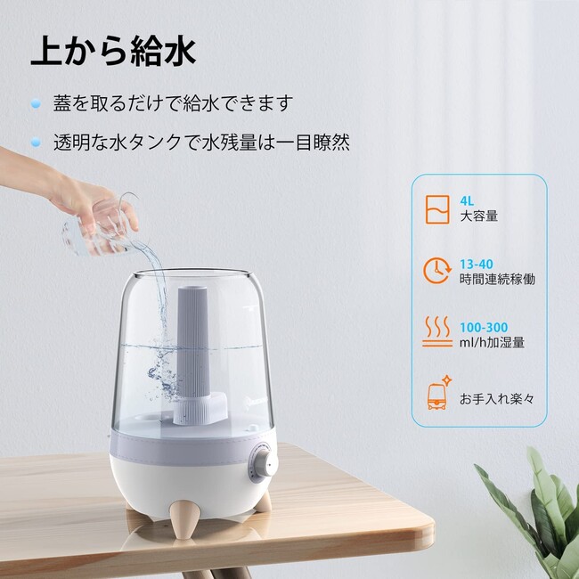 3つの給水方法があり、蓋を閉めた状態でも上から給水が可能です。加湿器が運転中でも給水可能なため、常にお部屋を潤します。運転中にタンクを取り外した場合や、水が少なくなった場合には自動的に停止します。約4Lの大容量タンクを搭載しているため最大40時間の長時間連続稼働を実現しました。また無段階でミスト量調節ができ、回転ノブ式を採用したため誰でも簡単操作が可能です。