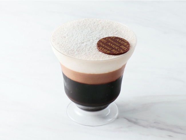 コーヒージュレになめらかなクレームブリュレカフェショコラとアーモンドプラリネ入りシャンティを重ねた3層仕立てのグラスデザート。