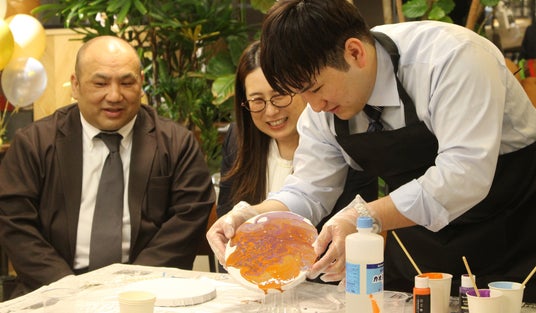 入社式における緊張感を和らげるアイスブレイクとして、1家族につき2枚のキャンバスを用意し、新卒社員とそのご両親が共同で「たらしこみアート」を制作しました。