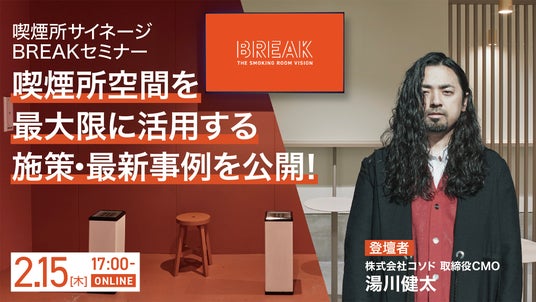 株式会社ニューステクノロジー(本社:東京都港区、代表取締役:三浦 純揮、以下ニューステクノロジー)は、株式会社コソド(本社:東京都千代田区、代表取締役:山下悟郎、以下コソド)と共同で、2024年2月15日(木) 17時より広告主・広告代理店向けに両社が運営する国内最大※のオフィス喫煙所サイネージメディア「THE SMOKING ROOM VISION BREAK」(以下「BREAK」)の媒体説明セミナーを開催します。