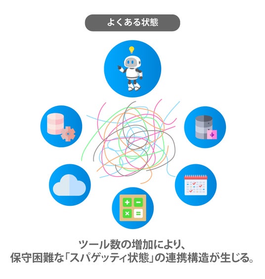 しかし、その実現には「AIと既存ツール・機能との連携」に大きな障壁がありました。これまで、AIと各ツールの連携には、個別のプログラムを開発する必要があり、ツール数が増えるほどシステム構造は複雑化し、保守困難な「スパゲッティ状態」に陥るリスクがありました。