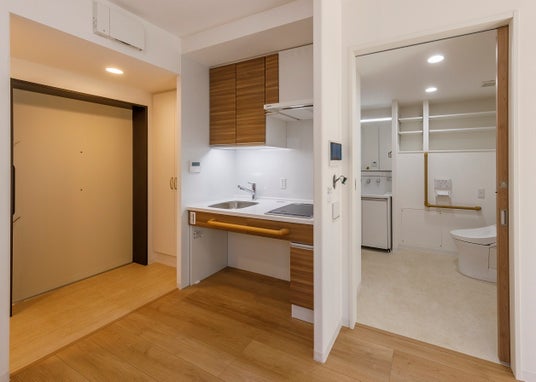 JKKが初めて建設した「JKKシニア住宅」は、高齢者が自立した生活を送れるよう、バリアフリー仕様となっており、玄関扉は引き戸を採用し、キッチンは高さを通常よりも低く設定し、IHコンロを備えています。また、住戸内の「緊急通報装置」で直接連絡ができる見守りサポート(HOME ALSOKみまもりサポート)や、人体などの熱を感知して安否確認ができる「空間センサー」による見守り機能も備えています。こうした設備等で高齢者の安心・安全な暮らしをサポートする点が評価を受け、平均倍率3.2倍につながったと思われます。