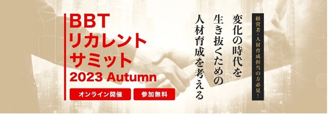 あらゆる年齢層に対し生涯に渡るリカレント教育を提供する株式会社ビジネス・ブレークスルー(所在地:東京都千代田区、代表取締役:柴田巌、以下BBT)は、経営者・企業の人材育成担当者を対象に、人材育成の専門家らが登壇する「BBTリカレントサミット 2023 Autumn」をオンラインで開催します。企業が持続的に成長するために必要な「人的資本経営」の実現、そしてその最難関である「経営人材の育成」をテーマにお送りします。