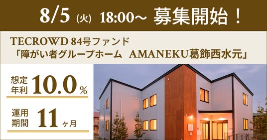 2025年8月5日(火)18時より84号ファンド「障がい者グループホーム AMANEKU葛飾西水元」の募集を開始いたします。