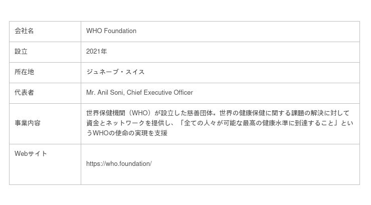 WHO財団は、WHOにより設立されたスイスの慈善団体で、慈善家・財団・企業・個人から資金やネットワークを募り、「健康を促進し、世界の安全を守り、弱い立場の人々を守る」というWHOが掲げる目的の達成を支援します。
