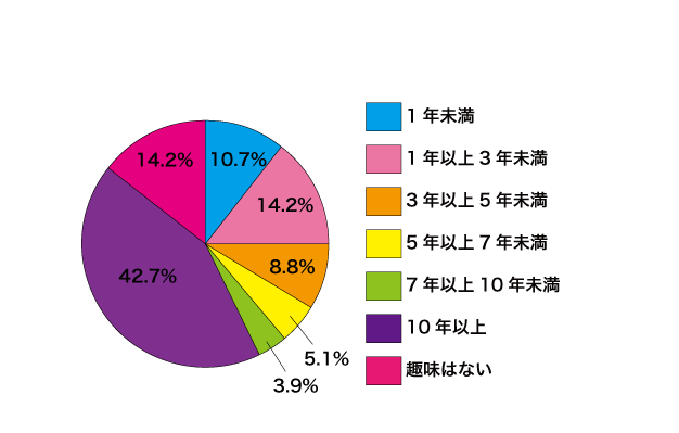 趣味の継続期間は10年以上と答えたモニター会員の声が約5割を占めていました。