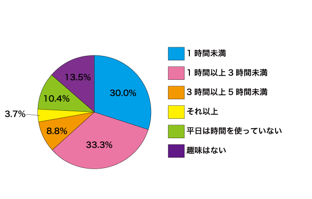 「平日は時間を使っていない」との声もあり、比較的長時間である「3時間以上5時間未満」の回答は休日の方が多いことが分かりました。