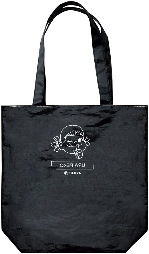 表面は黒地に裏不二家の日をイメージした「URA PEKO(ウラペコ)」のデザイン。「URA PEKO」を反転させたロゴで“裏”を表現しました。裏面は白地に「スマイルマーク」をあしらったデザインです。書類も入るA4サイズで使い道さまざま!