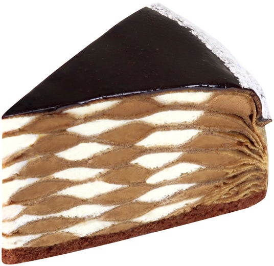濃厚なハイカカオチョコのクリームと優しい甘さのピュアホワイトチョコのクリーム、ココアクレープ生地を重ねました。上面は艶やかなチョコグラサージュで仕上げた、アーガイル柄がかわいい不二家ならではの萌え断ミルクレープです。