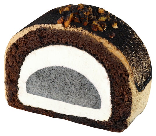 ミルキークリームと黒ゴマプリンを真っ黒なスポンジ生地で巻き、表面はブラックチョコシャンテリークリームを塗りました。上面にはキャンディングアーモンドとブラックココアパウダーをかけて、さらに真っ黒に! ミルキークリームと黒ゴマプリンが相性抜群です。