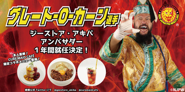 全国5カ所(秋葉原・大阪・名古屋・小倉・仙台)展開中のキャラクター・ライフスタイル・ストア「ジーストア」の運営などを手掛ける「タブリエ・マーケティング株式会社」は、「ジーストア・アキバ」アンバサダーに就任した新日本プロレス『グレート-O-カーン』選手考案の限定コラボメニューを発表。10月28日(金)より、「ジーストア・アキバ」内の<CURE MAID CAFE(キュアメイドカフェ)>にて提供する。