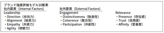 ブランド強度は、ブランドがロイヤルティを創出し、それによって将来にわたる持続可能な需要と利益を生み出す能力を測定します。ブランド強度の分析は、インターブランドが強いブランドを構成すると考える10の要素に基づく評価に基づいています。これらの領域におけるパフォーマンスは、業界内の他ブランドとの相対的な比較によって評価されます。ブランド強度分析は、ブランドの強みと弱みに関する洞察に満ちたスナップショットを提供し、将来に向けてブランドの強度と価値を高めるための活動ロードマップを作成するために使用されます。