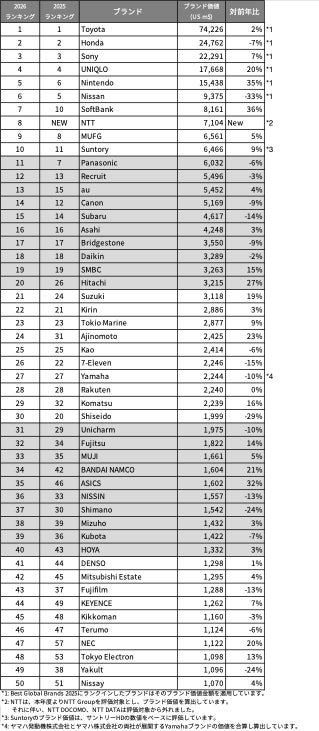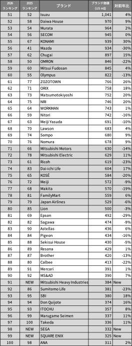 - NTT、Mitsubishi Heavy Industries、SEGA、SQUARE ENIXの4ブランドが初ランクイン