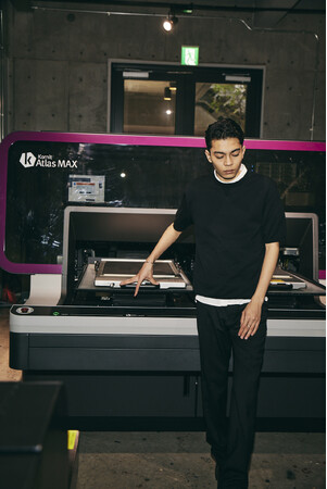 プラザクリエイトは、2022年よりアパレル事業に本格参入し、原宿・神宮前にアパレルファクトリー&カフェの「HATTO CREATIVE PLAZA」を展開してきました。イスラエル製の最先端衣類プリンター、Atlas MAX(アトラスマックス)を設置し、必要なときに必要な分だけ印刷する「オンデマンドプリント」で、無駄を出しにくいものづくりをしています。