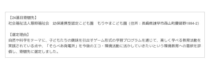 今後も「幼稚園にソーラー発電所を☆プログラム」を継続し、1基でも多くの「そらべあ発電所」を幼稚園・保育園に寄贈することで、子どもたちの環境に対する関心を高めるためのサポートをしていきます。