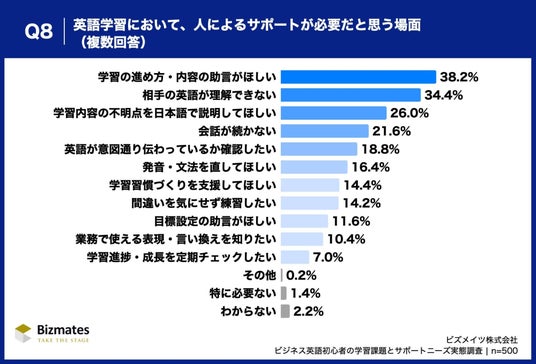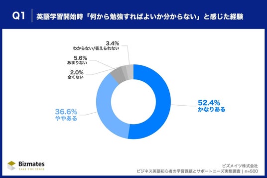 ビズメイツ株式会社(本社:東京都千代田区、代表取締役社長:鈴木 伸明、以下「当社」)は、仕事上の必要性をきっかけに1年以内に初級レベルで英語学習を始めた社会人500名を対象に「ビジネス英語初心者の学習課題とサポートニーズ実態調査」を実施しました。