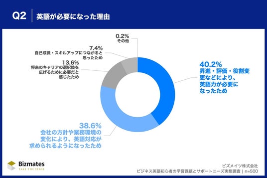 Q2「英語が必要になった理由として、最も当てはまるものをお選びください。」(n=500)では、「昇進・評価・役割変更などにより、英語力が必要になったため」40.2%が最多で、「会社の方針や業務環境の変化により、英語対応が求められるようになったため」38.6%が続き、両者で78.8%(約8割)を占めました。