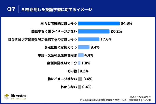 Q7「AIを活用した英語学習について、あなたのイメージに最も近いものをお選びください。」(n=500)では、「AIだけで継続は難しそう」34.6%が最多となり、「英語学習に使うイメージがない」26.2%が続きました。「AIが自分に合う学習法を見極めて提案するのは難しそう」17.6%も含めると、過半数がAI単独での継続や学習設計に不安を感じていることが分かります。