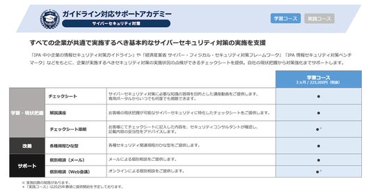 お求めやすい2つの価格帯を設けており、セキュリティガイドライン対応を始められたばかりのお客様向けには「学習コース(3ヵ月間:税抜22.5万円)」、そして、ガイドライン対応が進み、セキュリティレベル維持と改善を目的とするお客様向けには「実践コース(9ヵ月間:税抜45万円)」をご提供します。