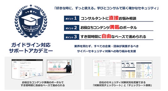 新しくなった『ガイドライン対応サポートアカデミー』は、「好きな時に、ずっと使える。学びとコンサルで築く確かなセキュリティ」をコンセプトに、お客様のセキュリティレベル向上を「アカデミー形式」で支援するコンサルティングパッケージです。