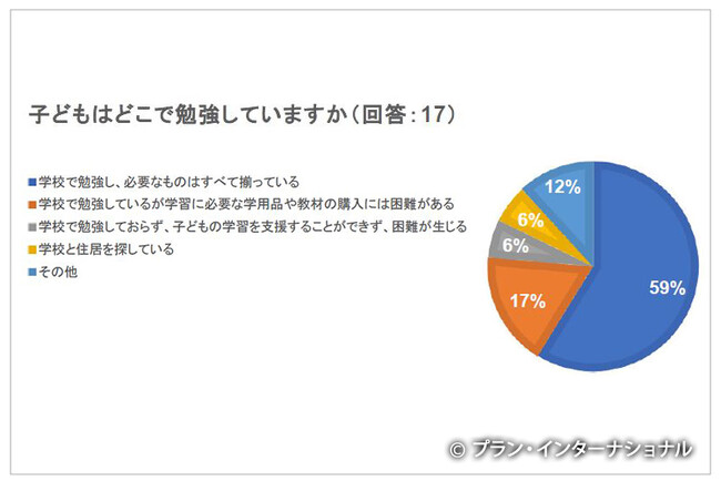 約60%の子どもは、学校で勉強するために必要な学用品や教材などを所有していましたが、約17%が、避難して日が浅いために教材など購入できていなかったり、経済的理由で、備品や教材などを持っていないことが分かりました。