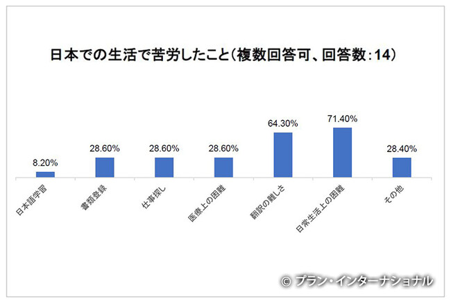 日常生活上の問題(71.4%)と言葉の問題(64.3%)が最多。その他にも、言語学習、仕事探し、書類手続きや医療の難しさなどが挙げられました。