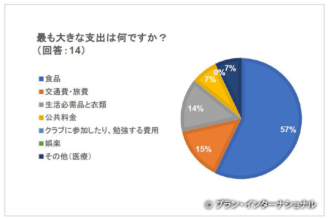 支出で最も多いのは食費(57%)です。また、交通費や生活必需品(約30%)も大きな負担となっています。