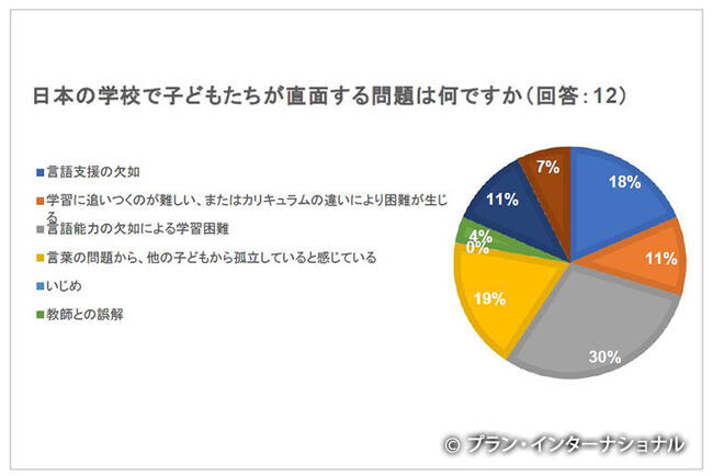 約半数の53%の子どもたちが地元にある日本の学校で学んでいるものの、日本語で勉強することは非常に難しく、カリキュラム通りに学習することは困難と考える割合は67%に上ります。また、約42%が学校の言語サポート不足を指摘しており、多くの子どもたちが孤立を感じています。そのような状況にもかかわらず、母親の中で、日本の学校で子どもがいじめにあったということを確認した人はいませんでした。