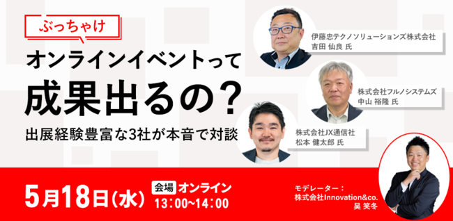株式会社イノベーション(グロース 証券コード3970)のグループ会社である、株式会社Innovation & Co.(本社:東京都渋谷区、代表取締役社長:遠藤俊一、以下「Innovation & Co.」は、『ぶっちゃけオンラインイベントって成果出るの?出展経験豊富な3社が本音で対談』をテーマとしたセミナーを2022年5月18日(水)に開催します。