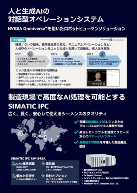 ヘッドウォータースが提供する対話型AIデジタルヒューマンは、NVIDIA (本社:米国カリフォルニア州) の音声ソースから豊かな表情のアニメーションを生成するAI搭載アプリケーション「NVIDIA Omniverse(TM) Audio2Face」(※2)と、シーメンス(本社:ドイツ ベルリン、ミュンヘン 以下「シーメンス」)の産業向けラックPC「SIMATIC IPC RW-545A」(※3)を活用することで、自然な会話能力と高度な情報処理能力を兼ね備えたシステム提供を実現します。