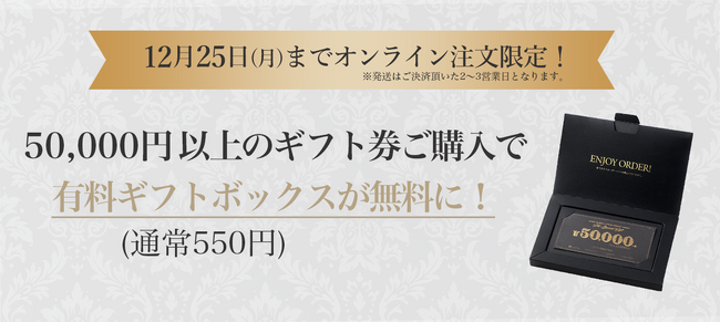 オンライン注文限定で12月25日(月)までの間、50,000円以上のギフト券をご購入いただいたお客様に、通常有料の豪華ギフトボックスを無料でお付けいたします。