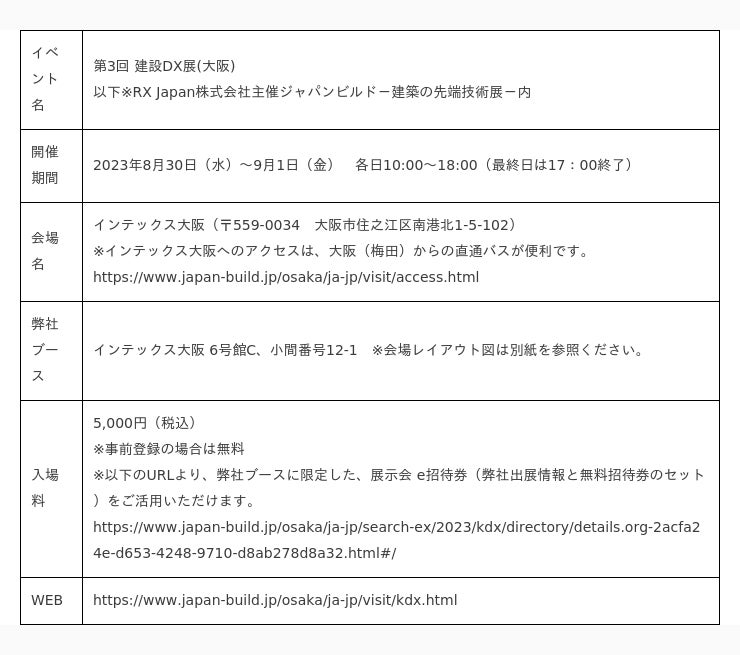 ・BuildApp 第3回 建設DX展(大阪)に出展(8/30~9/1)(2023/7/19)