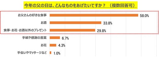 その結果、1位は「お父さんの好きな食事」で58.0%、2位は「お酒」で33.8%、3位は「食事・お花・お酒以外のプレゼント」で29.8%という結果になりました。(複数回答可)