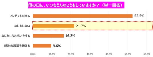 また、「お父さん以外の方」(子どものいない男性、女性)17,515名を対象に、【母の日と父の日に、いつも行っていること】について質問した結果、「なにもしない」の回答が、父の日(31.5%)は母の日(21.7%)に比べて約10ポイント高く、母の日のお母さんほど、父の日に祝ってもらえないお父さんが多いことがうかがえました。
