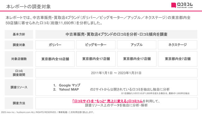 今回は、中古車販売・買取店4ブランド(ガリバー / ビッグモーター / アップル / ネクステージ)の東京都内全店舗に寄せられた口コミ(総数11,690件)を分析しました。