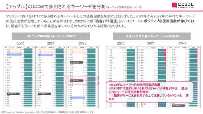 アップルにおける口コミで多用されるキーワードとその使用回数を年別に比較しました。2021年から2022年にかけてキーワードの使用回数が急増していることが分かります。2022年には「接客」や「迅速」といったワードのポジティブな使用回数が伸びており、顧客がどういった面に満足感を示しているのかがよく分かる結果となりました。