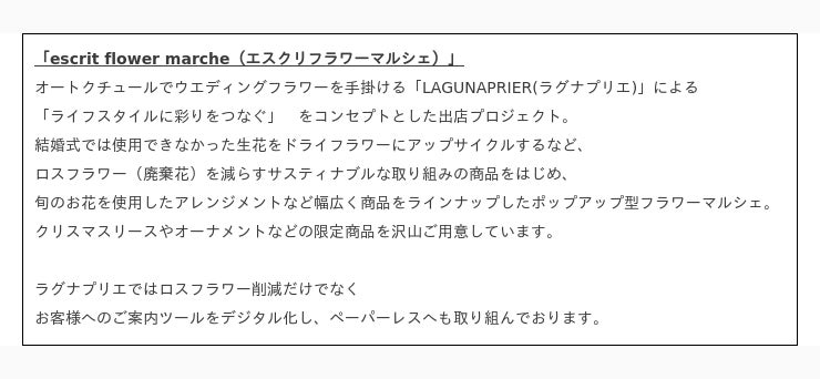 挙式・披露宴の企画・運営を主たる事業として展開する株式会社エスクリ(本社:東京都中央区、代表取締役社長CEO:渋谷守浩、東証スタンダード:証券コード2196 以下、エスクリ)のオリジナルフラワーブランド『LAGUNAPRIER(ラグナプリエ)』で、期間限定クリスマスマーケット「escrit flower marche(エスクリフラワーマルシェ)」を開催いたします。