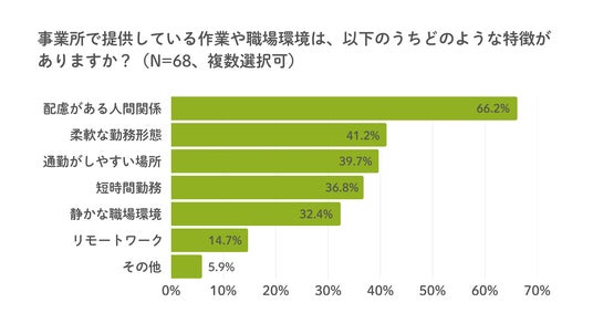 利用者の「安定して働きたい」というニーズに対し、事業所側はどのような環境を提供しているのでしょうか。「事業所で提供している作業や職場環境の特徴」を聞いたところ、「配慮がある人間関係」と45事業所が回答(66.2%)し最多となりました。