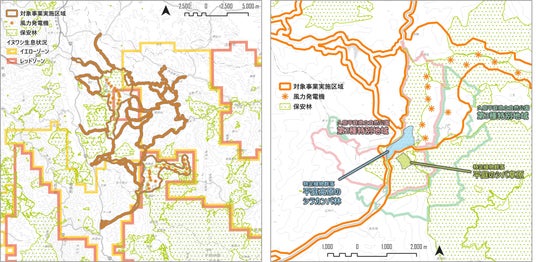 図:事業実施区域および風車設置個所と保安林およびイヌワシ生息状況との重なり(左)、事業区域(南エリアの平庭峠周辺)と保安林および県立自然公園、特定植物群落との重なり(右)