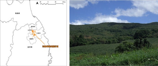 写真:対象事業実施区域(左、データ出典:国土数値情報 行政区域)、風車建設予定地の様子(右)