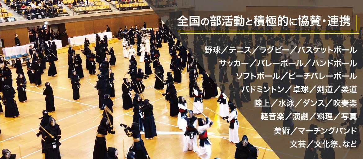 当社では部活動の大会・イベントに関して、種目・競技を問わず支援・協賛をしています。「大会」「強化試合」「カップ戦」「合同キャンプ」などの各イベントへ「連携」「協力」「協賛」を積極的におこなっています。冊子協賛や会場協力なども可能です。