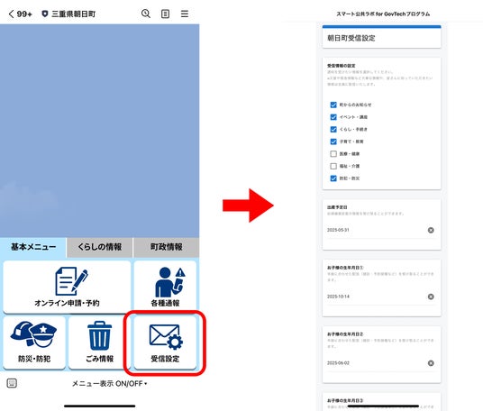 住民の希望に応じた配信だけを届ける「セグメント配信」機能を導入、欲しい配信カテゴリーを「受信設定」に回答することでカスタマイズすることができます。住民がほしい情報に絞って配信ができるため、町からの情報発信がこれまで以上に効果的になることが期待されます。