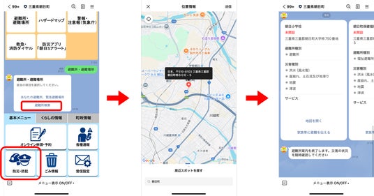基本メニューのチャットボットの案内に従って、「避難所・避難場所」→「避難所検索」から起動することができます。