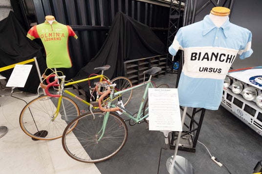 会場には、2人が活躍した当時のロードレーサーとして、1951年頃のビアンキ、1947年当時のレニヤーノといった貴重な自転車が、彼らのジャージと共に展示されされました。