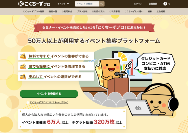 『こくちーずプロ』は、2009年よりこくちーずが運営しているイベントポータルサイト「こくちーず」を大幅拡張し、もっと使いやすく、集客力を更に向上させ2015年より稼働しているイベント集客プラットフォームです。登録料・手数料は無料で、現在、会員数は50万人を超えて成長を続けています。